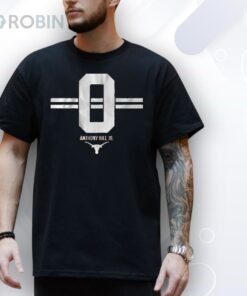 Cheer on Texas football with bold style, featuring a striking 0 design and Anthony Hill Jr.'s name. The double stripe adds dynamic flair, while the iconic silhouette below completes the look. This shirt is your go-to for game days or casual outings, showcasing your enthusiasm and pride in a unique way. Ideal for fans looking to make a statement on and off the field.