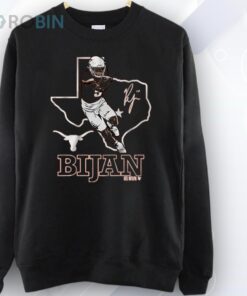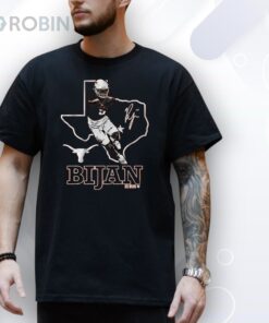 Capture the essence of Texas pride with this striking shirt featuring a dynamic football silhouette set against the iconic state outline. The bold Bijan lettering adds a personal touch, perfect for passionate sports fans. Whether you're at a game or out and about, this design speaks volumes about your love for football and the Lone Star State.