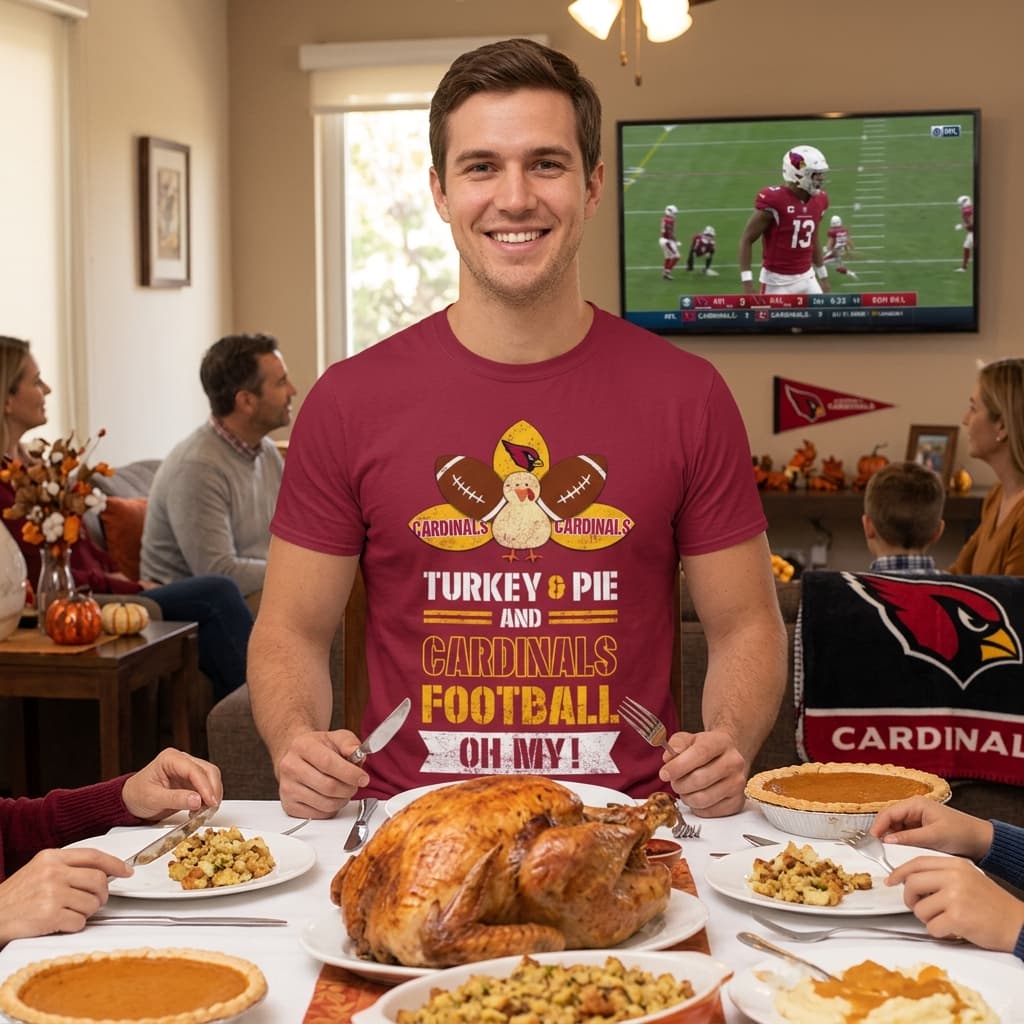 There’s something about wearing your fandom on your sleeve—literally—that feels right, especially when the season calls for both football and family. This Cardinals Thanksgiving football shirt grabs attention without trying too hard. Bright, autumn colors mingle with bold, blocky varsity lettering that immediately signals team pride with plenty of festive flair. The design plays up the best parts of the holiday and game day. Cardinals logos blend seamlessly with football imagery but don’t stop there. A cheeky turkey graphic, complete with a football tucked under its wing, shares the spotlight alongside warm pies and falling leaves. The composition feels fun, not cluttered, striking a playful balance between spirited sports and the cozy vibe of Thanksgiving. If you’re someone who loves Sunday football as much as the turkey dinner afterward, this is exactly your kind of go-to. It speaks to Cardinals fans who want to celebrate their team while staying casual and comfortable around family or friends. It’s the kind of shirt that sparks conversations at the table or cheers in the stands. Whether you’re gifting it to the die-hard sports lover who never misses a game or picking it out for your own Thanksgiving rotation, this shirt fits right in with the season’s mood. Casual enough to wear throughout the weekend, it’s a festive nod to football and fall, wrapped into one straightforward, spirited look.