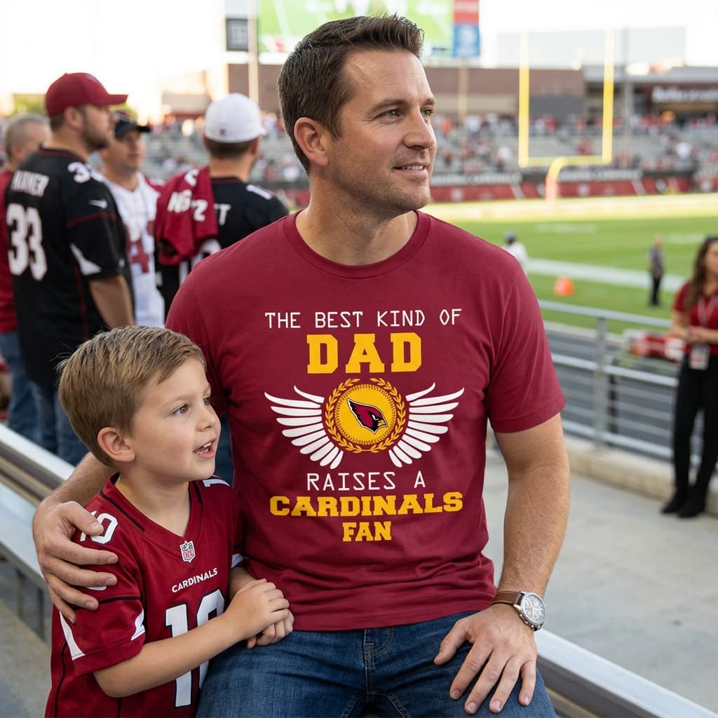 The centerpiece of this shirt commands attention with a bold, blocky DAD emblazoned across the chest, its lettering styled in a varsity-inspired sans serif that speaks to a timeless sports culture. Wings sprout from either side of the text, suggesting strength and pride, while a circular emblem subtly encircles the design, grounding it with a sense of unity. The maroon and gold palette recalls the unmistakable colors of the Arizona Cardinals, creating a vivid contrast that pops against the fabric without overwhelming it. This is more than just a shirt; it’s a statement of identity for dads who wear their fandom openly and with a quiet confidence. The collegiate-inspired typography hints at tradition and loyalty—a fit for someone who doesn’t shy away from showing support in spirited yet straightforward fashion. Whether it’s cheering from the stands or gathered around the TV for game day, the design carries the energy of community and family all rolled into one. Ideal for the Cardinals dad who balances pride in family with a love for the game, this shirt fits naturally into weekends spent at family barbecues, stadium trips, or simply sharing moments with other fans. As an Arizona Cardinals dad shirt, it offers a familiar yet unique way to celebrate that connection—a gift that feels personal, thoughtful, and steeped in shared passion.