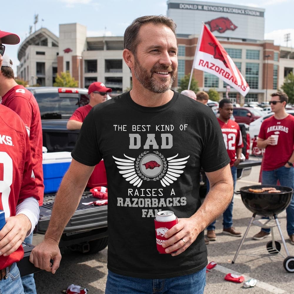 There’s a certain pride that comes with wearing your allegiance visibly, especially when it blends fandom with a nod to personality. The Best Kind Of Dad Arkansas Razorbacks Unisex Shirt captures that uniquely proud spirit without ever feeling over the top. Its design centers on a bold, winged emblem framing the iconic Razorbacks logo, rendered in sharp monochrome grays and whites against a deep black backdrop. The block capital sans serif text sits confidently above and below, enhancing the shirt’s straightforward, powerful presence. This shirt resonates particularly well with dads who wear their Razorbacks loyalty like a badge of honor, especially those who enjoy a bit of lighthearted wit with their team spirit. It’s not just about being a fan—it’s a statement of identity for the kind of dad who’s both supportive and ready with a dad joke during tailgates or game-day gatherings. The subtle humor and proud tone make it a thoughtful choice for any Razorbacks dad who appreciates apparel that feels genuine rather than flashy. Game days, local meetups, or family sports events are natural moments to sport this shirt. It’s also a smart pick when searching for a gift that combines fandom and familial pride without losing that laid-back, familiar vibe. For anyone looking to highlight the best kind of dad in a Razorbacks wardrobe, the razorbacks dad shirt fits that niche effortlessly.