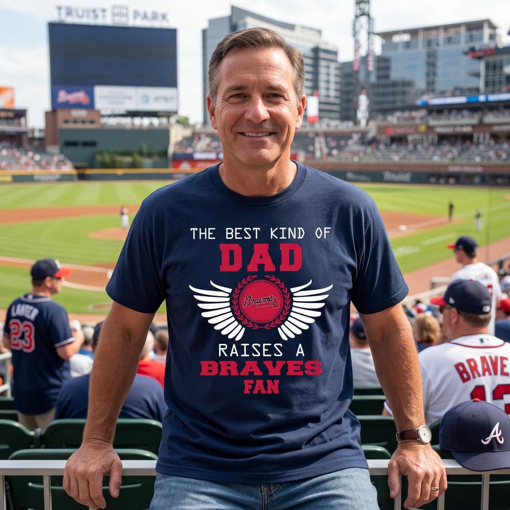 There’s something electric about a shirt that commands attention with bold crimson and stark white set proudly against a deep navy canvas. This is exactly what draws the eye on The Best Kind Of Dad Atlanta Braves Unisex Shirt. The design centers on a winged emblem, sharp and dynamic, wrapped in a circular laurel that feels both timeless and spirited. Block sans serif typography dominates, with the words DAD and BRAVES stamped confidently, making it clear where loyalties lie. This shirt doesn’t just shout team pride—it feels like an extension of a personality that’s equally bold and steadfast. It’s for the dad who bleeds Braves red and white, someone who lives for the crack of the bat and the roar of the crowd. The collegiate vibe interwoven with patriotic elements adds a layer of pride beyond baseball, capturing a spirit that’s both familial and fiercely loyal. Perfect for Father’s Day, a game day, or just showing up as the family’s number one fan anywhere, this shirt fits people who wear their heart—and their team—on their sleeves. Whether it’s layered under a jacket at the ballpark or paired casually for a weekend barbecue, it’s a statement piece that resonates with dads who want to celebrate their identity in a fresh and unapologetic way.