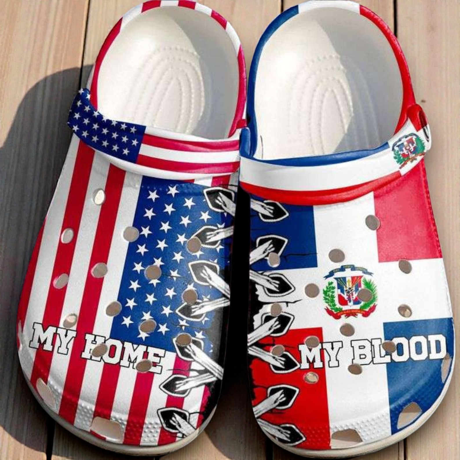 There’s something about showing where you come from that goes beyond just words. It’s a feeling—rooted deep, loud but clear. These Crocband Clogs wear that pride on their sleeve, blending the iconic American flag with the vibrant colors of the Dominican Republic. It’s a graphic mashup that doesn’t shy away. Bold block text spells out My Home My Blood, reminding anyone who sees them that identity isn’t complicated—it’s powerful and direct. Look closer and you’ll notice the scattered coin-like holes across the upper, giving these clogs a bit of playful texture without losing their statement. Stylized hands reach across the foot surface, hinting at connection and unity—two nations intertwined in story and spirit. The typography stands firm in uppercase, with shadow effects that punch through the design, making sure the message isn’t just seen but felt. These are shoes for those who don’t just wear their hearts on their sleeves but underfoot—casual, yet packed with meaning. They pair effortlessly with denim shorts, plain tees, or even a relaxed button-up. Perfect for neighborhood cookouts, national holidays, or whenever the mood strikes to share your heritage casually but noticeably. If you’re someone who identifies with both Dominican and American roots, or you know someone who does, these patriotic Crocs fit naturally into that lifestyle. More than just footwear, they’re a conversation starter and a quiet nod to where you belong—sometimes all you need is a simple step to say it loud.