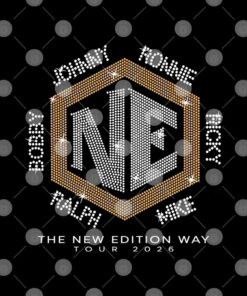 - Oversized “NE” emblem with a dotted, rhinestone-style look
