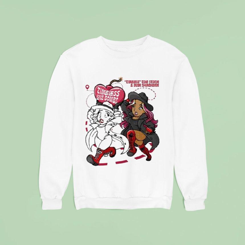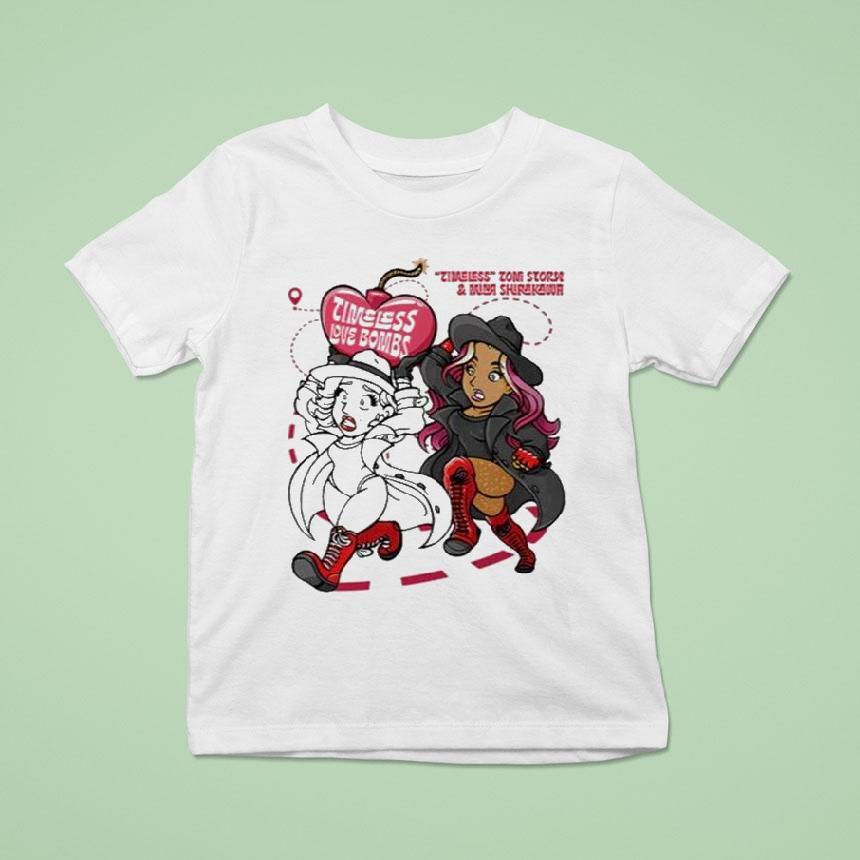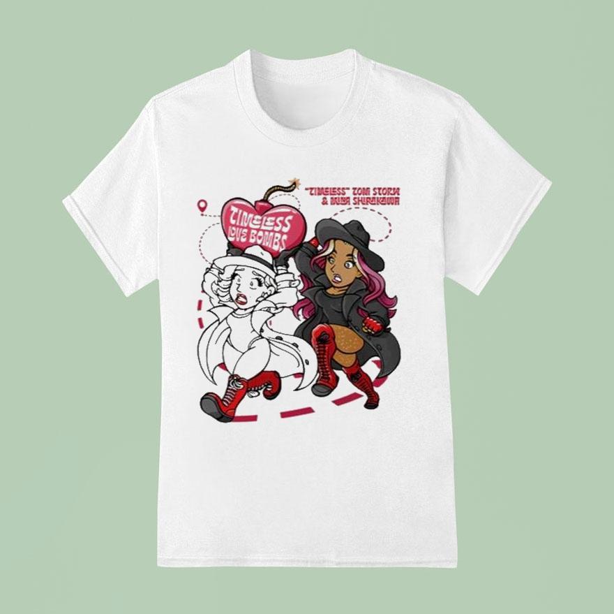 Two stylized female characters dash forward, their movements frozen mid-stride with dynamic motion lines that pulse with energy. Bright red and black accents slice through the design, creating a striking contrast that makes the figures and their surroundings leap off the fabric. Bold text bubbles hover nearby, one emblazoned with the phrase timeless love bombs, drawn in a comic-style display font that demands attention with thick strokes and high contrast. A single heart graphic punctuates the scene, anchoring the playful yet rebellious spirit of the composition. This shirt’s visual narrative captures a vibrant moment of action and attitude—perfect for kids and teens who gravitate toward graphic tees infused with quirky, comic-inspired characters. The placement of elements maintains a balanced chaos, as if caught in the middle of an animated panel where motion and emotion collide. It speaks to a bold personality that appreciates both fun and edge, someone who finds joy in designs that feel alive and unapologetic. Wearing a shirt like this extends beyond everyday comfort; it becomes a subtle statement of identity for young individuals who embrace playful rebellion and vivid storytelling in their style. Whether at school, casual meetups, or themed gatherings, the timeless love bombs on this tee are a graphic shout-out to those who enjoy expressing themselves with a dash of wit and a lot of heart.