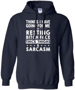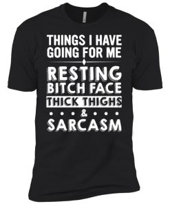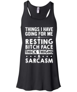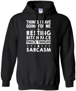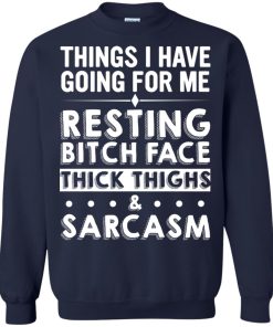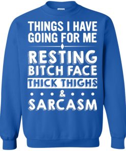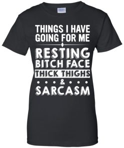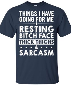 Things I have going for me resting bitch face thick thighs & sarcasm hoodie, tank, t shirt