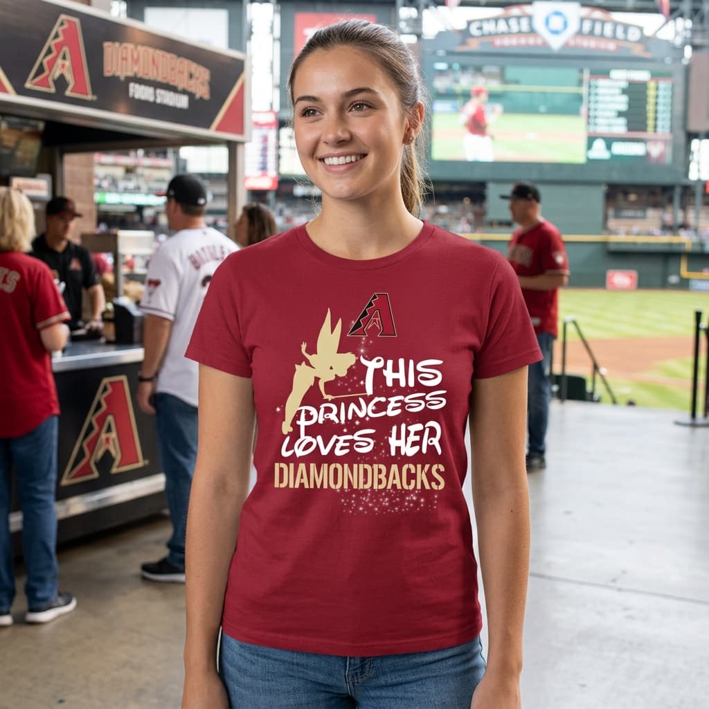 The silhouette of a poised princess catches the eye at the center, outlined with soft sparkles that shimmer against a deep maroon backdrop. Above her, delicate brush script spells out THIS PRINCESS LOVES HER with a playful yet confident flourish, while below, bold block letters declare DIAMONDBACKS in rich gold, echoing the team’s proud colors. These contrasting typography styles create a dynamic energy, perfectly balancing feminine charm with strong team pride. This diamondbacks princess shirt appeals to fans who want to wear their allegiance with a touch of personality. It’s not just about supporting the team; it’s a statement of identity—someone who embraces a spirited, fun-loving side alongside their dedication to Arizona’s diamondbacks. Whether cheering from the stands or gathering with friends for a game day, it’s a casual yet standout piece that feels both approachable and bold. Ideal for women and girls who appreciate a design that’s playful without losing its heroic edge, the shirt fits smoothly into relaxed, everyday styles. It also makes a thoughtful gift for someone who loves the team and the princess motif, something they can wear to show support while feeling uniquely themselves. For casual outings, stadium events, or just a catch-up with fellow fans, this shirt blends fandom and personal flair with ease and charm.