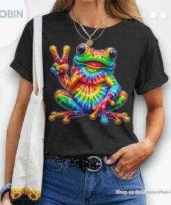 Embrace your inner free spirit with an enchanting blend of vibrant colors and whimsical design! Our latest offering features a playful amphibian sporting an iconic symbol of tranquility. Perfect for any gender, this shirt effortlessly merges retro vibes with modern flair, making it a must-have for those looking to amp up their wardrobe with a touch of bohemian charm and a splash of fun. Dive into a world of peace, love, and hippie style—this standout piece is your ticket to make a colorful statement anywhere you go!