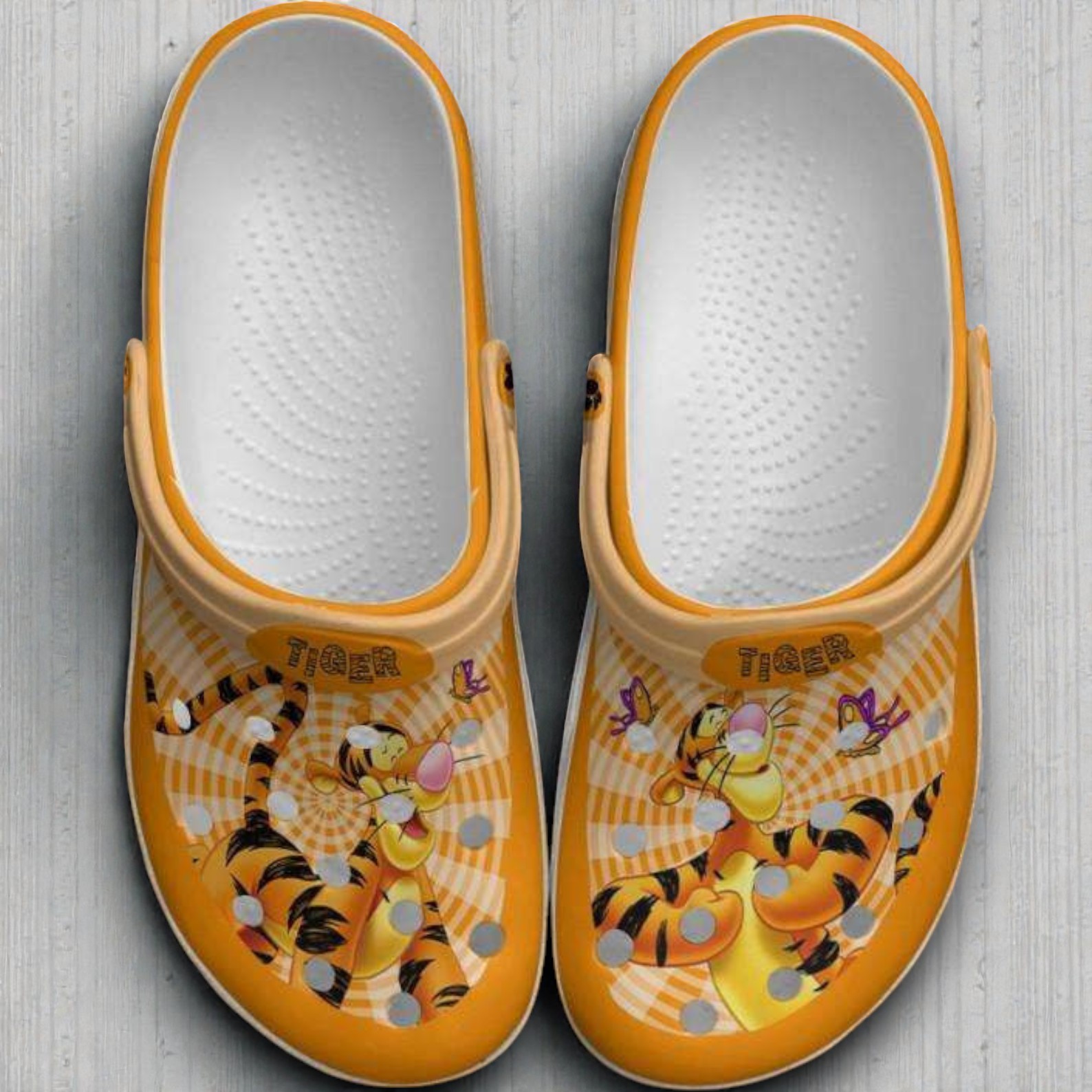 Bright orange bursts across the slip-ons like a sunlit jungle dawn, setting the scene for the fierce tiger prowling along the side. These Tiger Crocband Clogs don’t just wear a vibe—they roar it, blending the boldness of a wild feline with the joyful whimsy of cartoon floral art that dances around the edges. This isn’t subtle; it’s a loud, playful statement stitched into every curve. The tiger graphic captures that untamable energy, its stripes rippling alongside circular bursts that almost feel like rays echoing the animal’s spirit. Cartoon-style lettering and quirky characters contribute a mischievous charm, turning these clogs into a small animated world on your feet. The dotted texture on the sole isn’t just playful—it’s a nod to the attention to detail that makes these an easy pick for anyone who loves bold designs with a sense of humor. Perfect for children with a vivid imagination or adults who keep their fun side front and center, these clogs fit right into casual, sunny days indoors and out. They’re ideal for gifting to cartoon enthusiasts or those who appreciate a touch of novelty in everyday wear. Beyond their lively look, they catch the eye in collections, bringing a spark of energy to any shelf they occupy. Tiger Crocband Clogs embody a cheerful rebellion against the ordinary—suiting those who want to wear their wild side proudly without saying a word.