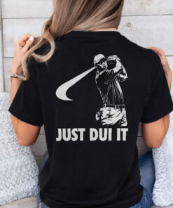 A stark silhouette of a golfer appears on the front, poised mid-swing beneath a sweeping arc that hints at both the motion of a drive and a subtle nod to something irreverent lurking beneath. The back carries a bold, blocky declaration in uppercase: JUST DUI IT. The typography is confrontational, oversized, unapologetically straightforward—an edgy twist on athletic bravado that grabs attention without needing explanation. This isn’t a shirt for quiet afternoons on the putting green; it’s made for those who appreciate the game but aren’t afraid to poke fun at its darker moments. It fits right into the wardrobe of anyone who loves golf but thrives on the humor and irony woven into sports culture, especially someone who knows the stories behind the headlines as well as the perfect swing mechanics. Layer it under a casual jacket or pair with worn-in jeans for weekends spent at the driving range or casual outings with friends who get the joke. Wearers of this shirt carry a confident mix of fandom and cheekiness—people who can appreciate Tiger Woods’ legacy while acknowledging its complicated, human side. It’s a conversation starter, a tongue-in-cheek nod to sports clichés and headlines, and a distinctive choice that blends bold graphic humor with a laid-back, everyday vibe. The phrase JUST DUI IT captures that irreverent spirit effortlessly, making it a natural fit for those who find humor and identity on the fringes of sports culture.