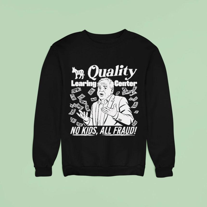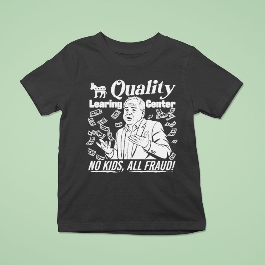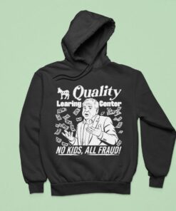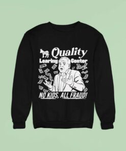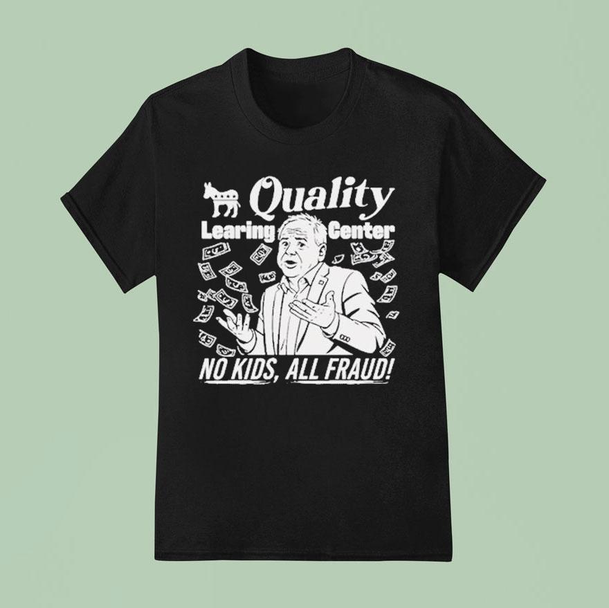 A stark black-and-white image commands attention—a man clutching wads of cash, dollar bills fluttering around him like a chaotic storm. Bold, uppercase text slices through the graphic with unapologetic confidence, spelling out a tagline that’s both sharp and biting in its satire. The entire layout strikes a powerful balance between graphic intensity and clear messaging, capturing eyes and holding them long enough to provoke a reaction. This Quality Learning Center parody shirt isn’t designed for subtlety. It speaks directly to those who appreciate political humor that challenges the narrative with wit and edge. It’s a statement, worn not just for laughs but as a declaration of skepticism and individuality. This isn’t background noise—it’s a bold visual voice screaming defiance against the absurd. Perfect for anyone who thrives on satirical commentary, appreciates confrontational design, or simply enjoys wearing their opinions on their sleeve—literally. Whether it’s at a casual hangout, a protest, or just sparking a conversation, the shirt pulls together personality and perspective in one striking graphic. Those who choose this piece value irony and aren’t afraid to challenge mainstream takes, making it an unapologetic icon in the wardrobe of the politically savvy and humorously rebellious.