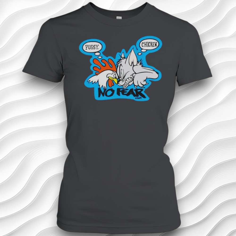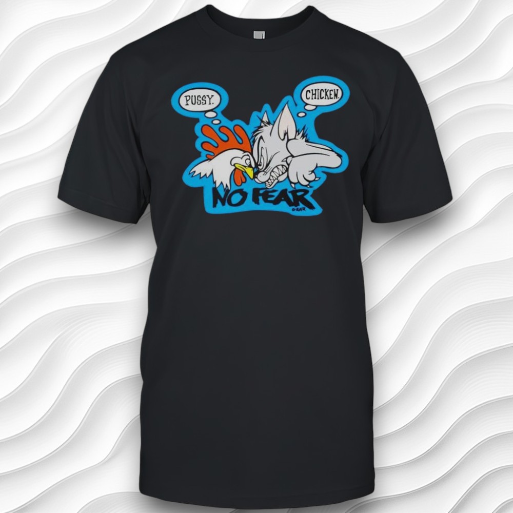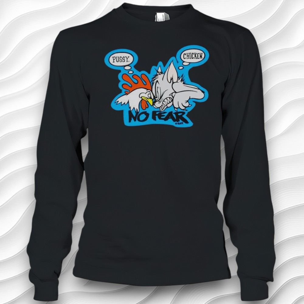 I just saw this tee that totally caught my eye—it’s got this wild cartoon vibe going on that feels both retro and kinda punk at the same time. The shirt itself is a dark gray, which makes this bright blue outline around the design really pop. In the center, there’s this crazy aggressive chicken with a red fist raised up like it’s ready to throw down. The chicken’s white, and the whole image feels super animated and lively, almost straight out of some edgy comic strip. What really makes the design stand out are the speech bubbles—one says “Pussy” and the other “Chicken,” all handwritten in this bold, jagged comic font that’s got a real rebellious energy. And right beneath it, there’s that bold “NO FEAR” text that kind of sets the whole tone of the shirt: defiant and playful but with an edge. It’s exactly the sort of graphic you’d want if you’re into streetwear that doesn’t take itself too seriously but still makes a statement. I honestly think anyone who’s into playful, offbeat fashion could rock this. It’s perfect if you like tees that feel like part conversation starter, part inside joke, especially if you love the whole cartoonish, rebellious look. I could see this being a go-to for casual hangouts, concerts, or just when you want something that stands out without going over the top. Also, this kind of shirt would make a solid gift for friends who appreciate humor with a bit of bite or anyone who’s always down for something a little different in their wardrobe. It’s not your everyday graphic tee—it’s got personality, so it feels like a thoughtful pick for someone who likes their clothes to have a bit of an attitude. And since it’s got that “No Fear” vibe, it’s kinda perfect for anyone who likes to keep things bold but fun.