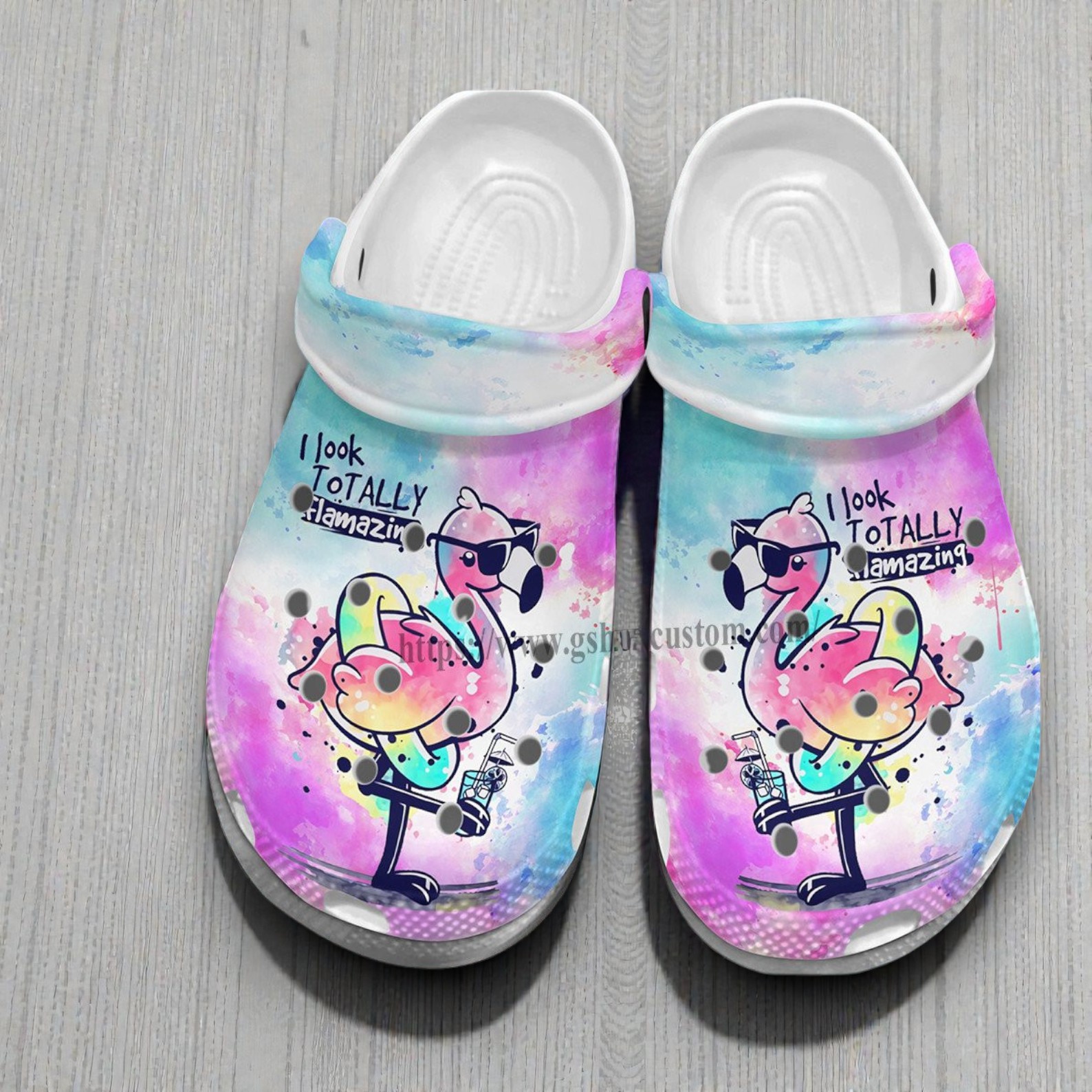 The design is bright and energetic, featuring a splashy watercolor background in shades of blue, purple, and pink. The main character is a hilarious cartoon flamingo wearing cool sunglasses and a swim ring, holding a cocktail, and living his best life. The text says it all: "I look TOTALLY flamazing."