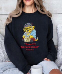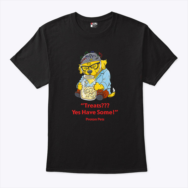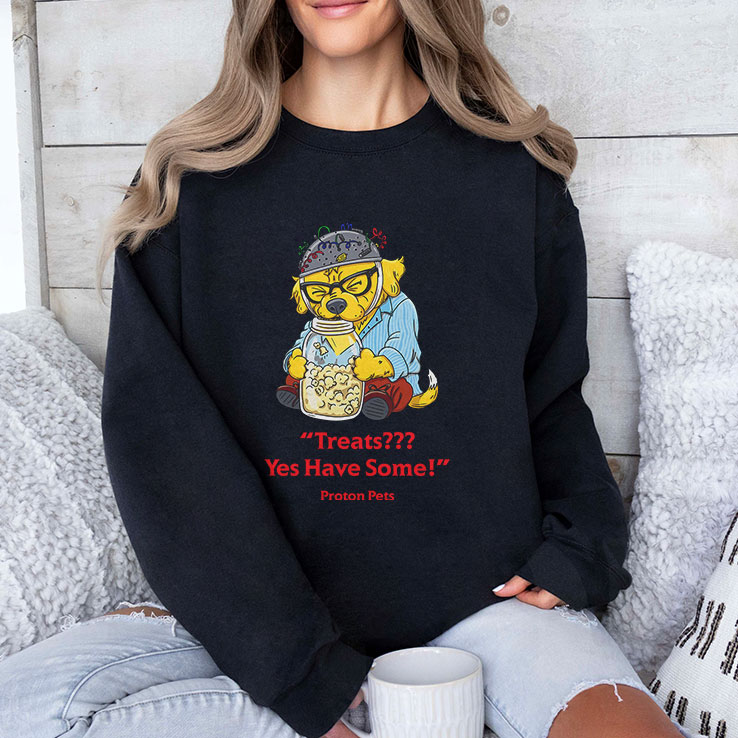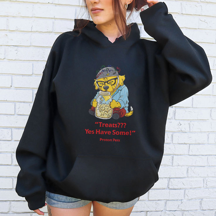 Quirky tees like this one seem to speak directly to the spirit of anyone who enjoys a little humor tucked into their daily look. The playful cartoon creature, a bright yellow critter decked out with glasses and a helmet, holds a jar of treats like a treasure. It’s impossible not to notice the bold red text, “Treats Yes Have Some,” splashed across the black fabric in a comic, retro-inspired font that bursts with cheeky energy. This design captures more than just a fun image—it’s an expression of belonging to a lighthearted subgroup of pet enthusiasts who appreciate humor layered with a pinch of nerdy charm. The phrase itself hints at a whimsical world where “Proton Pets” aren’t just characters; they represent a playful attitude toward everyday moments, like sharing snacks or joking with friends. People who’ve ever waited for an inside joke to unfold or cracked a smile over a silly pet meme might find this shirt hits just the right tone. It feels at home in casual settings—perfect for weekends spent lounging, strolls around your local park, or friendly gatherings where witty expressions break the ice. Wearing this tee can say something unspoken: a nod to those who walk the line between fandom and fun, effortlessly blending humor with a relaxed, personal style. It works well as a thoughtful gift for anyone who enjoys this blend of playful pet humor and retro comic flair woven into everyday wear.