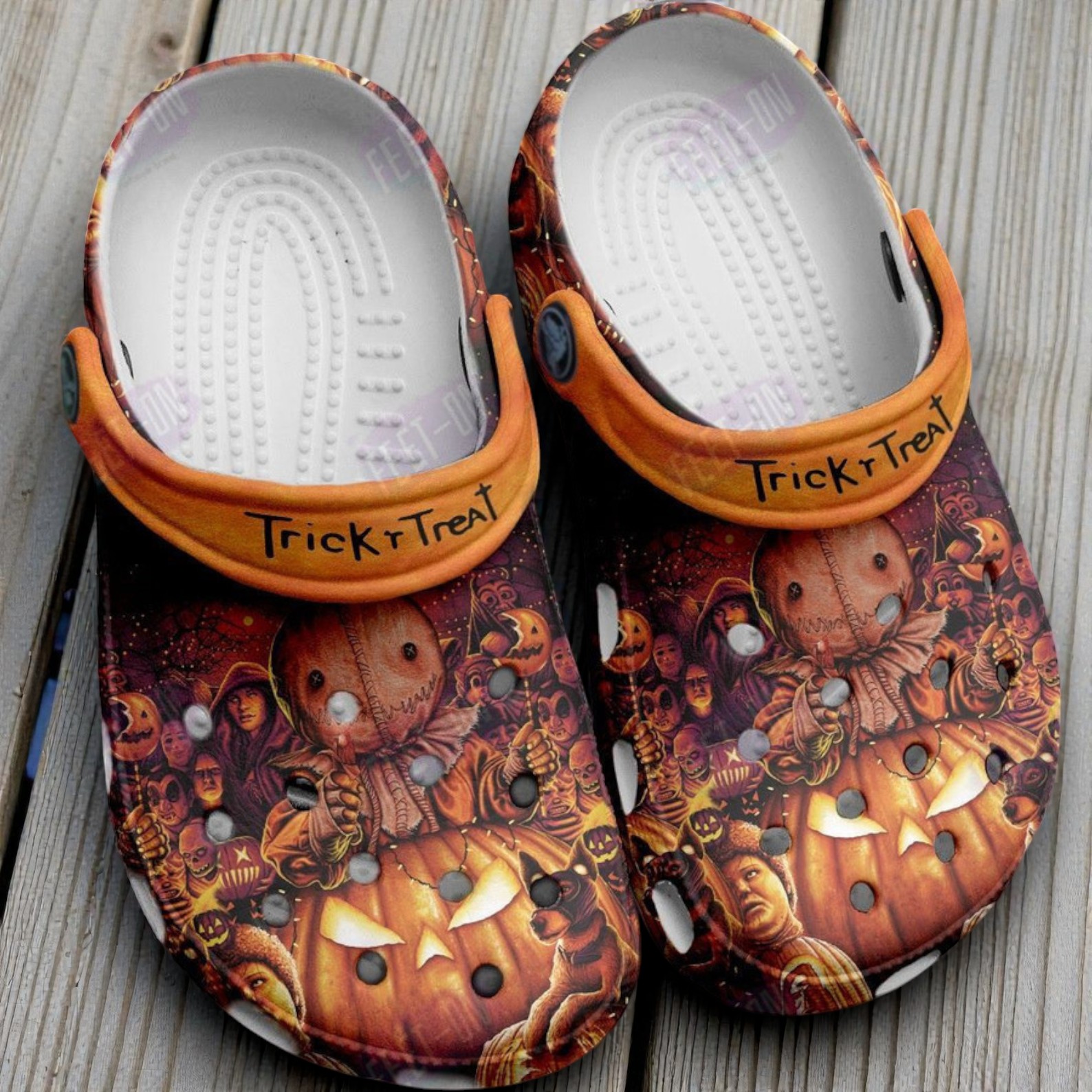 - Custom Strap: "Trick r Treat" text on a bright orange heel strap.