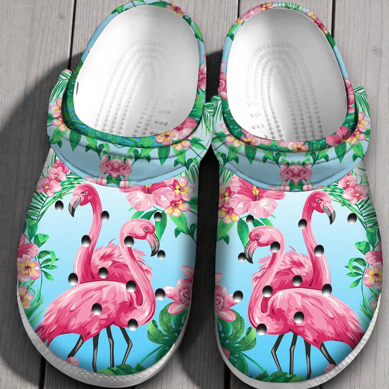 Bring the vacation vibe to your feet. These Crocs feature a bright, tropical scene with two pink flamingos surrounded by lush hibiscus flowers and green palm leaves.