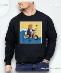 Get ready to ride the wave of style with our newest poster design featuring none other than Trump himself surfing on a bike while enjoying a drink! This unique and eye-catching design is sure to turn heads and make a statement wherever you go. Perfect for all Trump supporters or anyone looking to add a touch of humor to their wardrobe, this shirt is a must-have for any fashion-forward individual. Don't miss out on your chance to own this one-of-a-kind piece!
