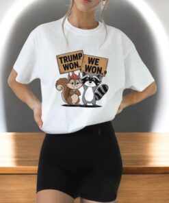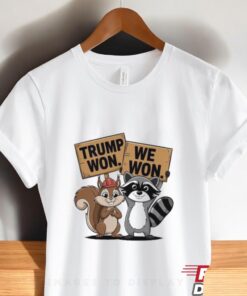 Unleash your quirky side and make a bold statement with our latest apparel featuring a unique and playful design that promises to turn heads. Embrace the humor and whimsy as you join an extraordinary duo—a charming peanut-loving squirrel and his mischievous raccoon friend—on their whimsical campaign adventure. This shirt isn't just clothing; it's a conversation starter, an expression of individuality, and a rallying cry for those who love a blend of politics and playful creativity. Stand out from the crowd with this eye-catching piece and celebrate the spirit of fun and freedom in every thread.