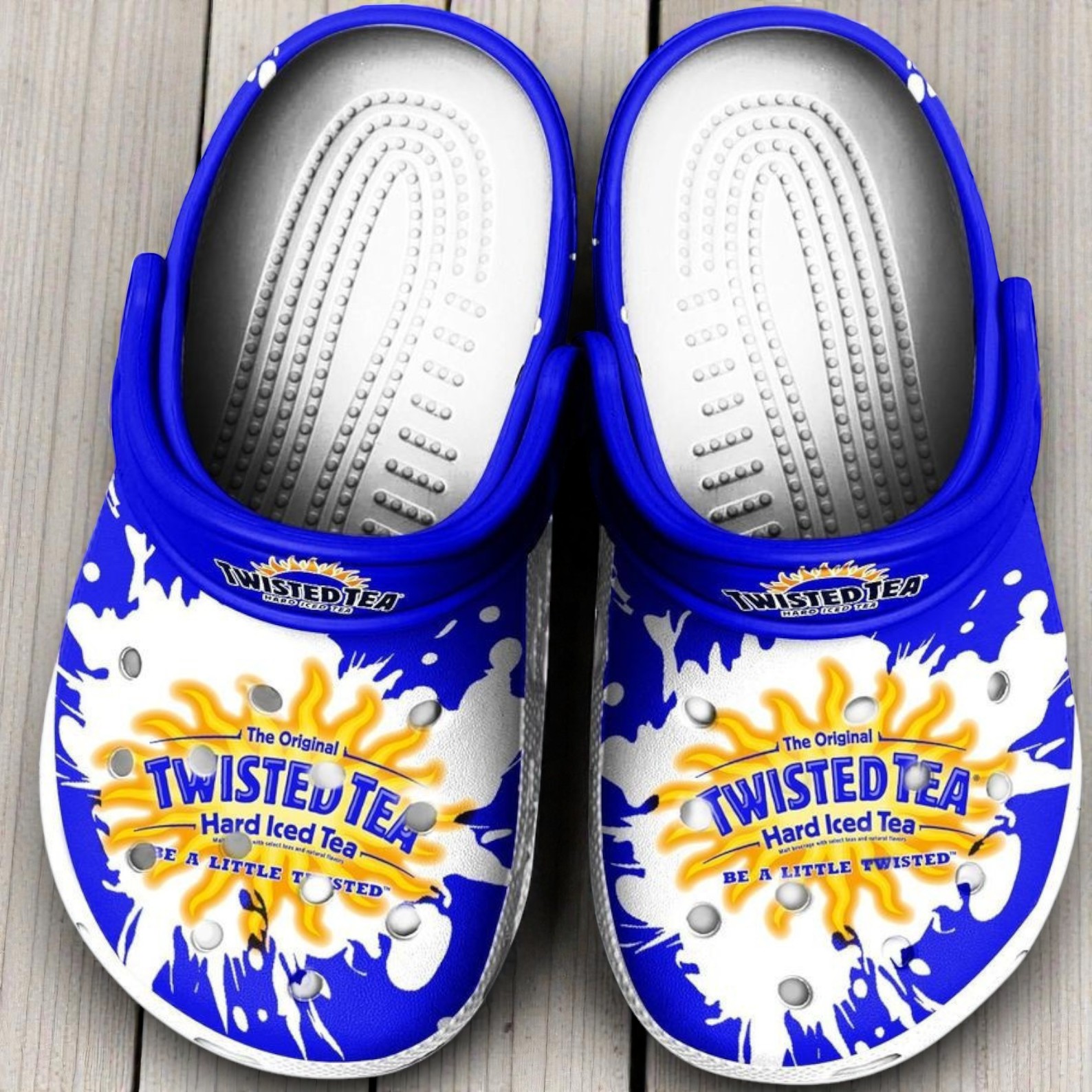 The moment your eyes catch the blazing sun etched across a vivid blue canvas, you can almost hear the clink of ice and a fizzy pour. These clogs carry more than just a bold print—they carry a mood, a hint of late afternoons at the backyard hangout or spontaneous road trips with friends. The fiery sun motif bursts with energy, its flames licking the edges of circular perforations that let air dance through. Splash patterns add movement and a playful narrative, as if the shoe itself is mid-toast, mid-celebration. Anyone drawn to the loud, unapologetic charm of the Twisted Tea brand will recognize this design as a symbol of fun times and no-holds-barred vibes. It’s not just footwear; it’s a wearable nod to those who enjoy the blend of bold graphics and lifestyle freedom—young adults who carry their iconography with spirited pride, novelty lovers looking for something that says “party but make it personal,” or fans who want a subtle shout-out to their favorite twist on a classic drink. These shoes fit seamlessly into everyday life, turning casual moments into a statement without shouting too loud. They also work beautifully as a gift—not flashy or forced, but something that speaks to shared experience, inside jokes, and the quiet thrill of finding something as unique as the wearer themselves. Twisted Tea clogs tap into a vibe that’s energetic, unmistakable, and perfectly at home wherever the summer sun might take you.