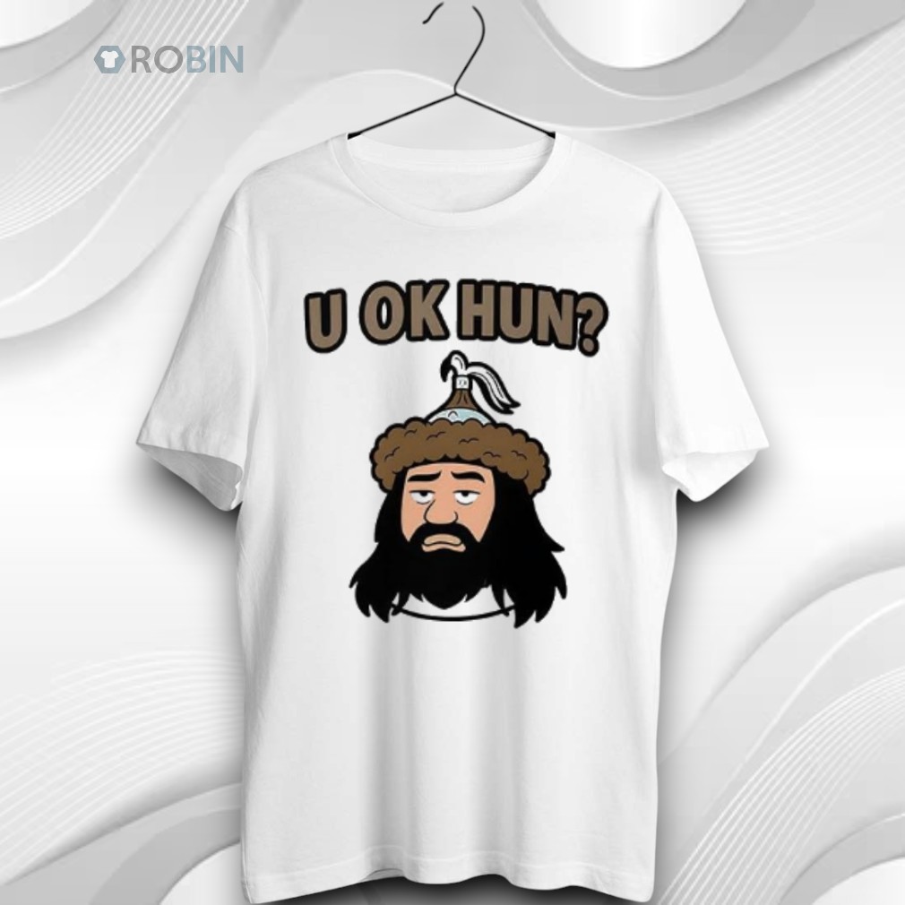 Conquer the empire of awkward small talk with the ultimate history pun. This tee features a hilarious cartoon portrait of Attila the Hun looking uncharacteristically concerned, paired with the classic internet phrase "U OK HUN?". It’s the perfect mashup of 5th-century warfare and modern-day sympathy.