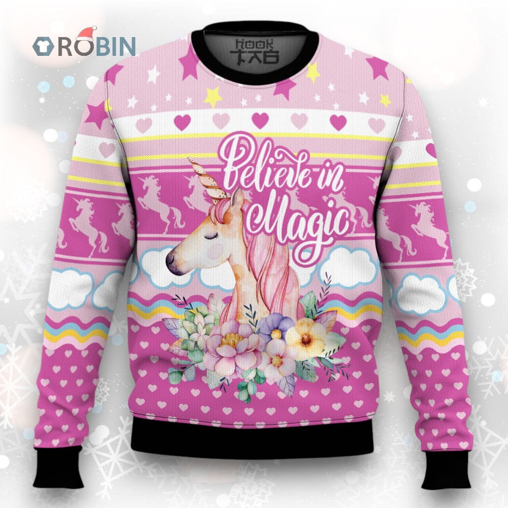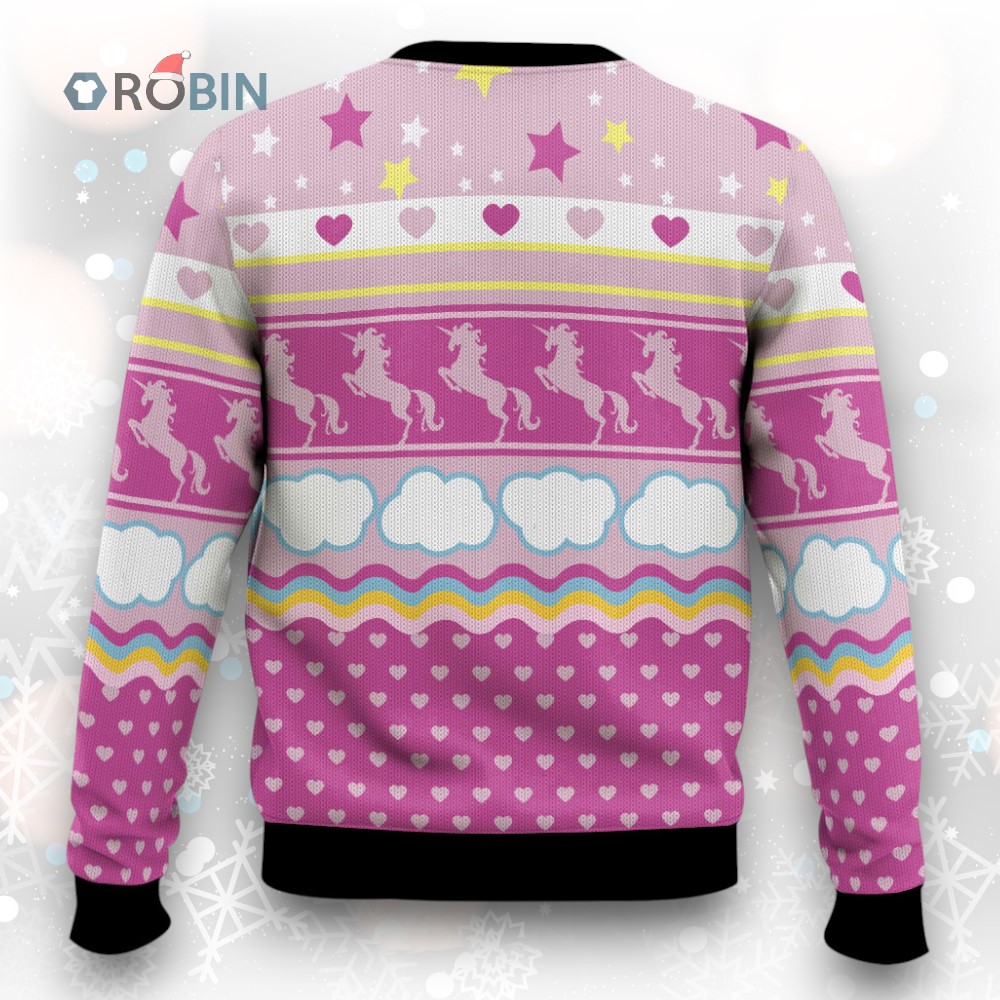 Spread holiday cheer with this whimsical sweater! Featuring a magical unicorn design, it's the perfect blend of festive and fun. Get ready to sparkle and shine at your next ugly sweater party. Cozy and oh-so-cute, it's a must-have for anyone who loves a touch of enchantment.