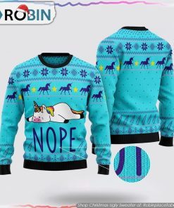Bring some whimsical fun to your holiday festivities with this unique and quirky Christmas sweater. Featuring an adorable unicorn graphic with the words Nope emblazoned across the front, this sweater is sure to make a statement. The vibrant colors and playful design add a touch of magic to any Christmas gathering. Made from soft and cozy materials, this sweater is not only eye-catching but also comfortable to wear all night long. Whether you’re attending an ugly sweater party or just want to spread some holiday cheer, this Unicorn Nope Ugly Christmas Sweater is the perfect choice.