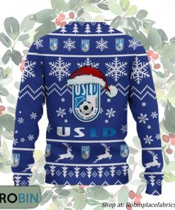 The USL Dunkerque Ligue 1 and Ligue 2 Ugly Christmas Sweater is an eye-catching and festive garment that showcases the spirit of the holiday season. This sweater is the perfect addition to any fan’s wardrobe as it beautifully combines the team’s iconic logos with classic Christmas elements. The vibrant colors and intricate designs make it a standout piece, enabling fans to proudly display their support for USL Dunkerque while celebrating the joyous festivities. Crafted with the highest quality materials, this sweater ensures both comfort and durability, making it the ideal choice for fans looking to show off their team spirit during the holiday season.
