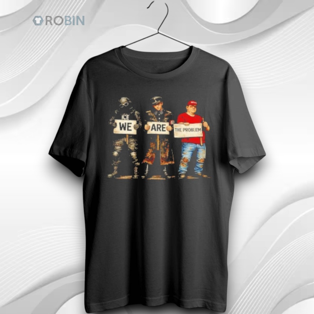 This powerful statement tee draws a direct line between the authoritarianism of the past and the political friction of the present. The design features three distinct figures holding signs that collectively read "WE ARE THE PROBLEM": a militarized tactical officer labeled "ICE," a historical fascist dictator, and a modern "Red Hat" supporter.