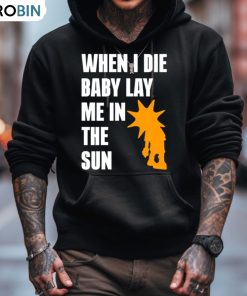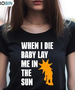 The 'When I Die Baby Lay Me In The Sun' shirt is a fun and stylish way to show your appreciation of life and a reminder that death is inevitable. The phrase 'When I Die Baby Lay Me In The Sun' is printed in bold bright yellow across a solid black background. The sentimental phrase is accompanied by a cheeky sun illustration, giving the shirt an edgy feel. Made with high quality cotton fabric, the shirt is comfortable to wear and easy to style. Perfect for a rock concert, a night out, or just running errands, the When I Die Baby Lay Me In The Sun shirt is an effortless way to show your appreciation of life and lighten the mood.