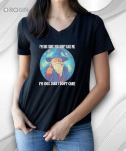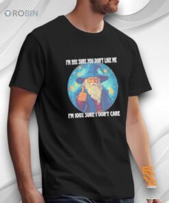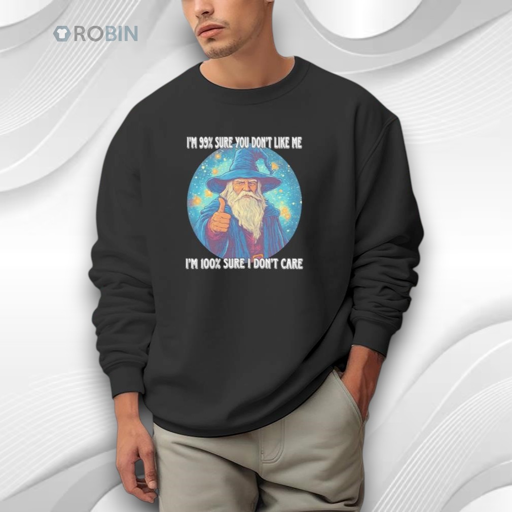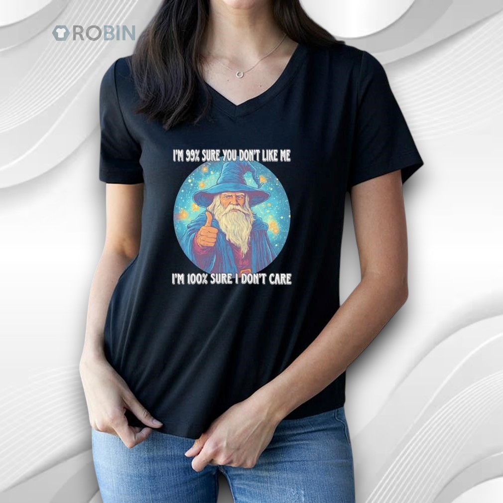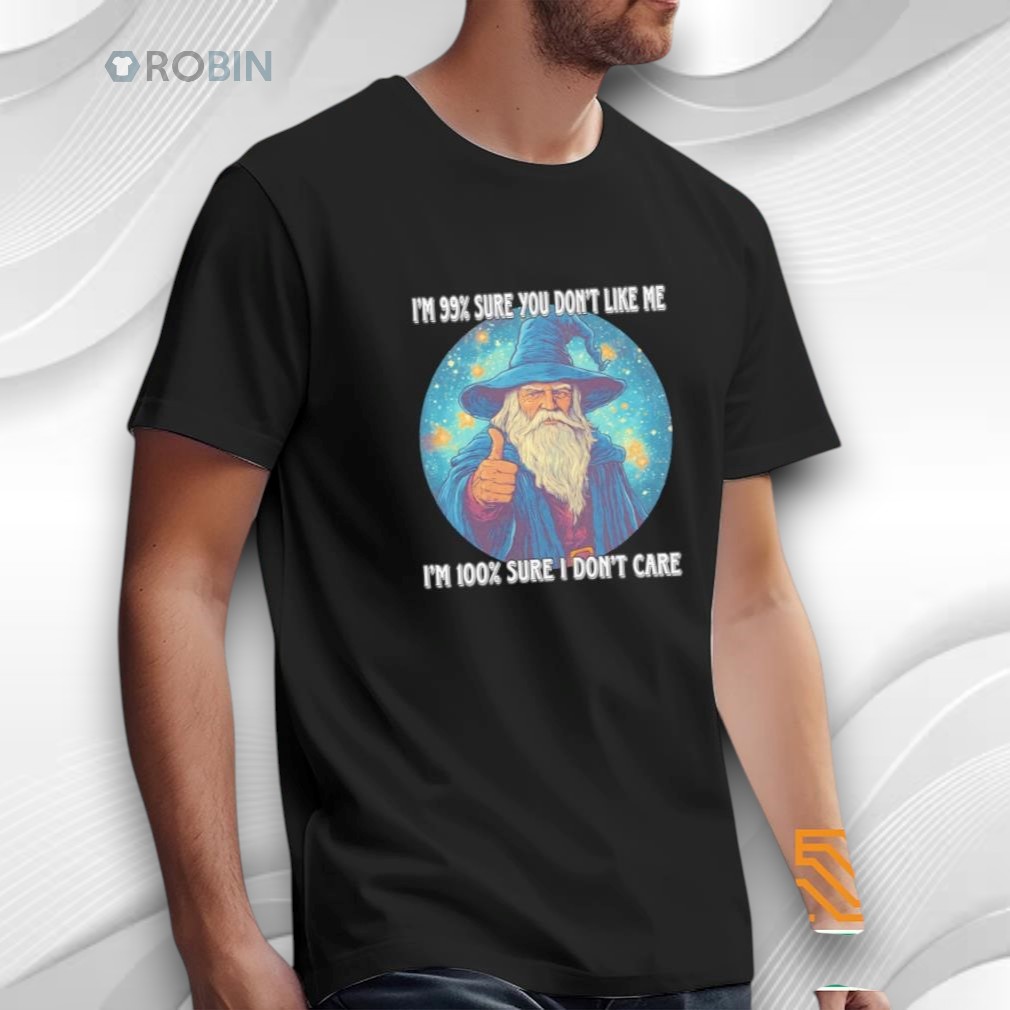 This bold and humorous shirt features a confident wizard illustration set against a glowing, cosmic-style background. The wizard gives a thumbs-up while the text reads, “I’m 99% sure you don’t like me. I’m 100% sure I don’t care.” The artwork blends fantasy style with modern humor, making the message both playful and powerful.