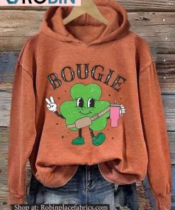 This stylish St. Patrick’s Day hoodie features a fun and trendy bougie shamrock print, perfect for celebrating in style. The green color scheme and festive design make it a great choice for the holiday. The comfortable hoodie is perfect for staying cozy on cooler days while showing off your Irish spirit. Stand out from the crowd with this eye-catching and festive hoodie that is sure to bring a touch of luck to your St. Patrick’s Day celebration.