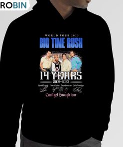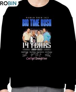 The World Tour 2023 Big Time Rush 14 Years 2009-2023 Can't Get Enough Tour Signatures Shirt is a must-have for any fan of the popular boy band. This shirt commemorates their successful 14-year career and features the signatures of all four band members. With a vibrant design and high-quality material, this shirt is perfect for showing off your love for Big Time Rush and their unforgettable music. Wear it to concerts, parties, or just as a daily reminder of your unwavering support for the band. Don't miss out on this limited edition shirt!