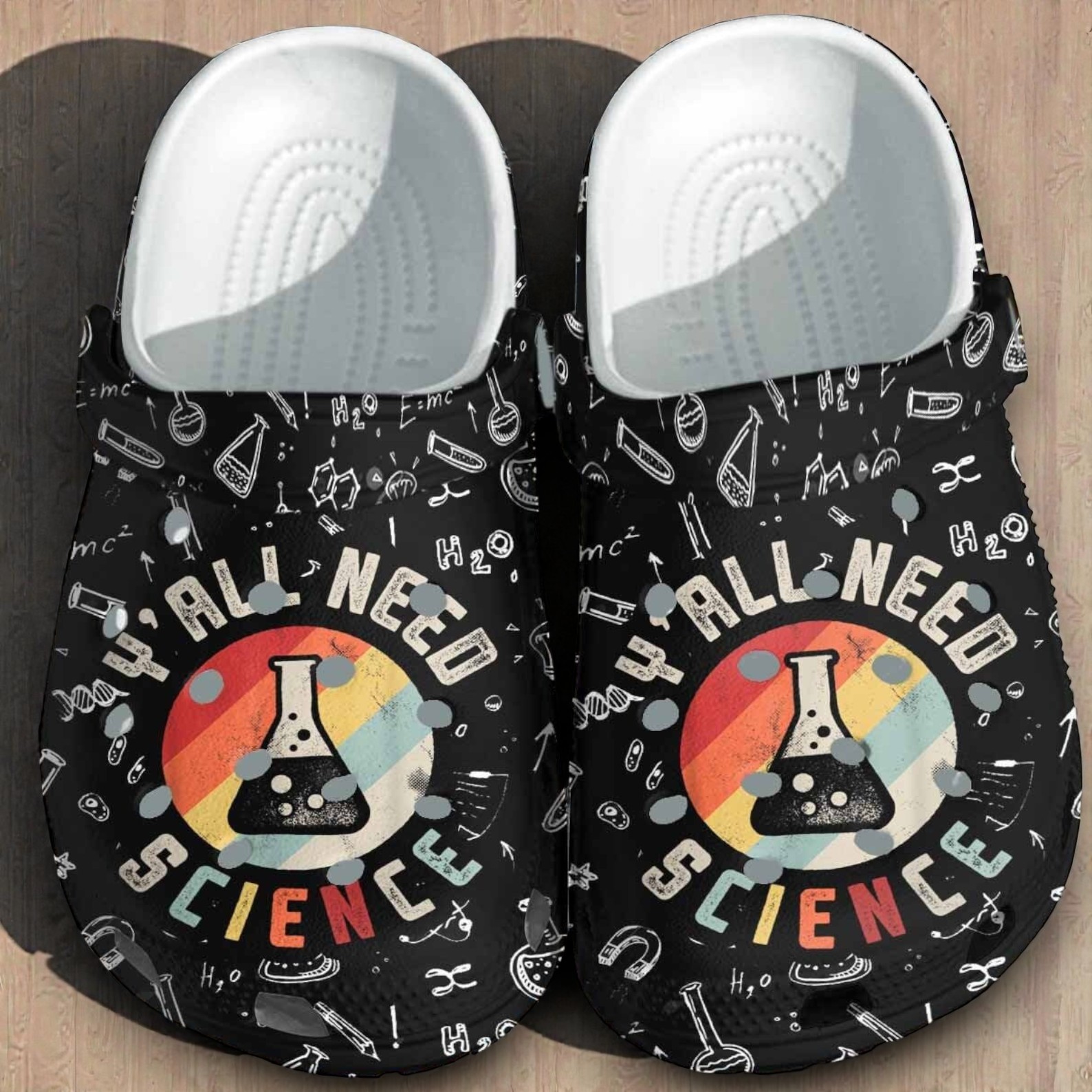 Got a long day of teaching biology, grading chemistry papers, or running tests in the lab ahead of you? Ditch the stiff, uncomfortable sneakers for something that actually has some personality. We designed these black Crocs specifically for the science nerds. The front features a vintage retro sunset with a chemistry beaker and the phrase "Y'all Need Science"—which perfectly captures that subtle frustration every science lover feels at least once a day. The rest of the shoe is completely covered in cool, white doodle-style DNA strands, atoms, magnets, and math equations.