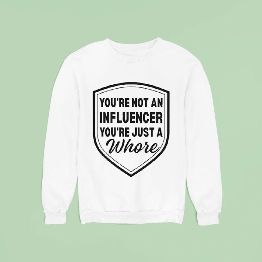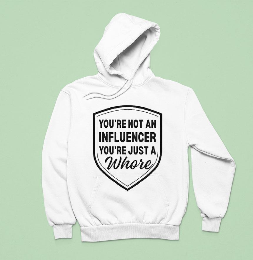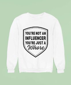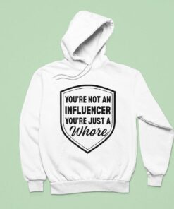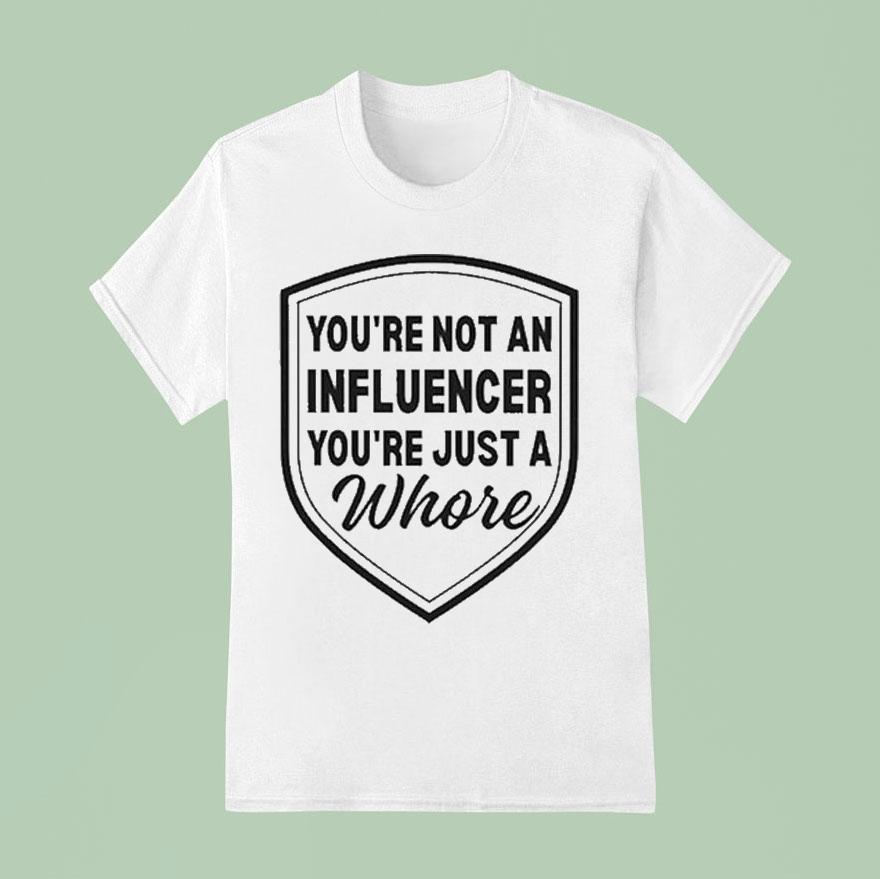 A sturdy shield-crest stands out on the shirt, the edges crisply defined as if it could hold strong against any backhanded compliment. The phrase “YOU’RE NOT AN INFLUENCER” stretches across the top in bold, uppercase letters—block sans-serif, no-nonsense and direct. Below it, the word “Whore” swoops across in a contrasting cursive script, sharp and unapologetic, carving its own rebellious identity into the design. This combination of armor-like symbolism and edgy typography appeals to those who navigate social media’s performative spaces with a sharp tongue and an irreverent sense of humor. It speaks to a subculture that’s skeptical of curated lives and glossy endorsements, a community that prefers blunt honesty over polished façades. Wearing this shirt becomes a form of self-expression that says, “I see through the hype, and I’m not playing by those rules.” People who enjoy challenging conventions—especially women comfortable with confrontational sarcasm—will find the design resonates deeply. It’s a bold piece for casual days when attitude matters as much as comfort, and it fits naturally into the rhythm of outspoken daily life. Among friends, particularly those who share a taste for blunt humor and unfiltered opinions, it could quietly serve as a nod or a shared joke, making it a fitting gift idea for those who appreciate a little rebellious flair without pretense.